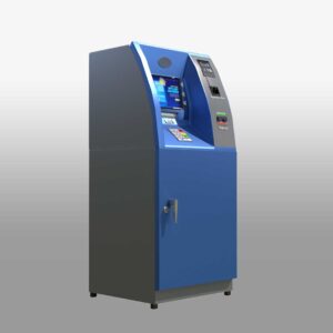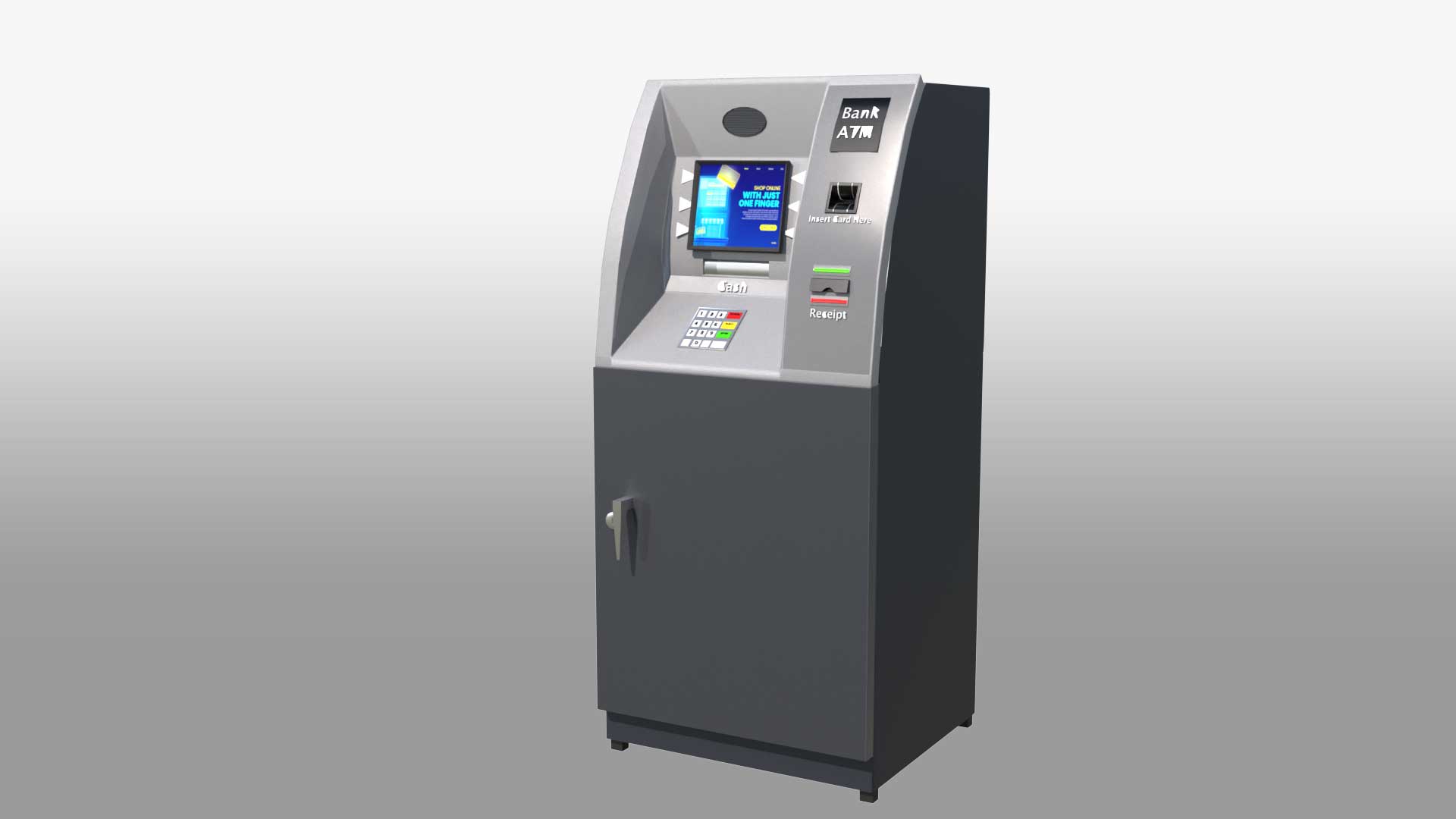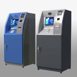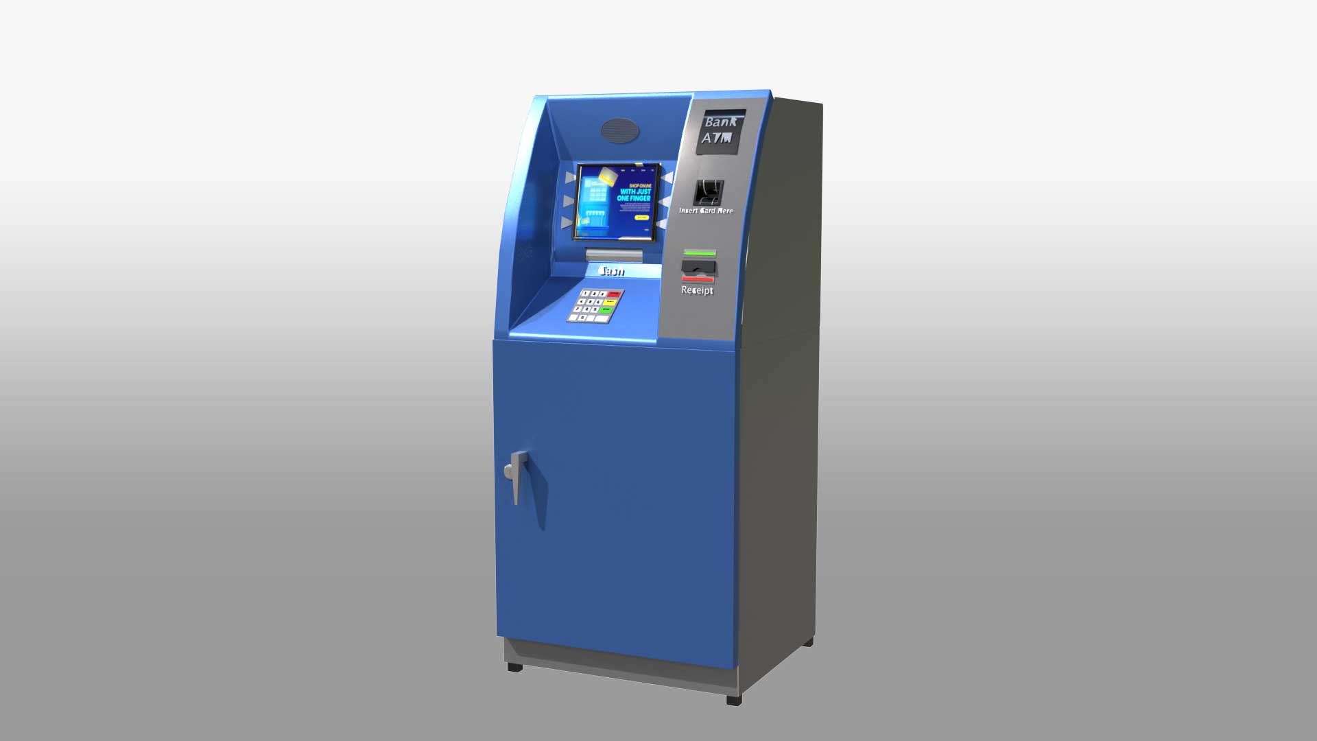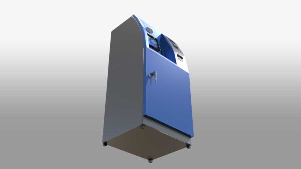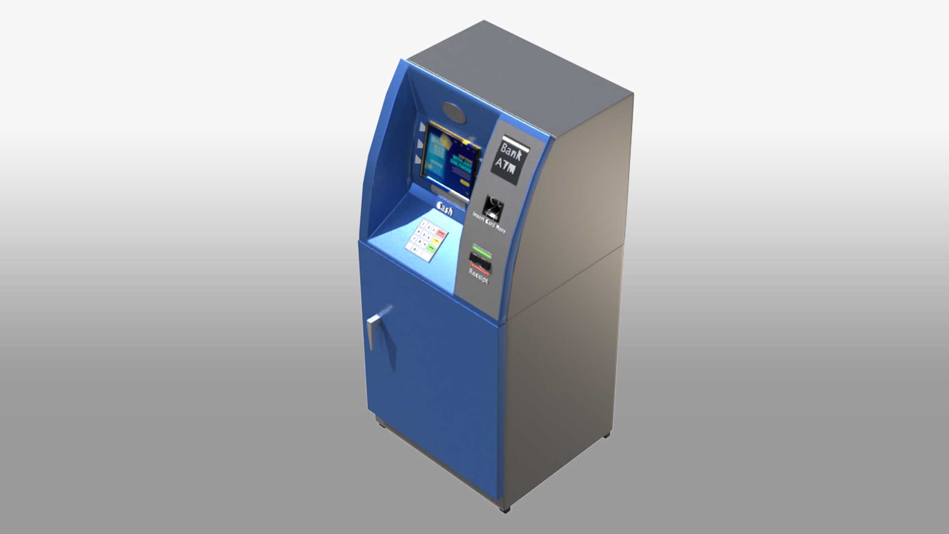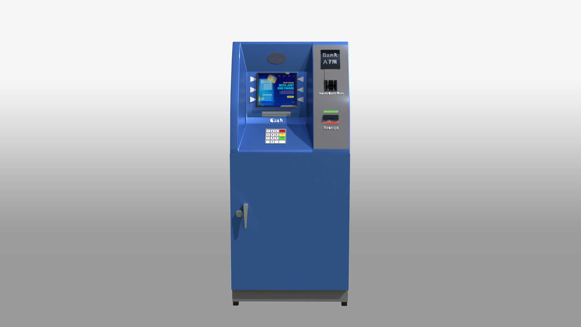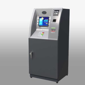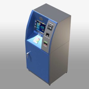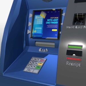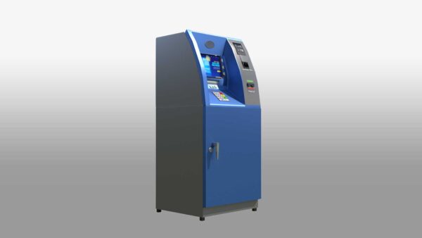 A 3D Automated Teller Machine (ATM) model showcases the key features and functions of a real ATM. This 3D banking machine stands tall like a human, with a sleek, modern design. It has a professional look with clean lines, making it an ideal virtual ATM for various uses. The model includes a screen, keypad, card slot, cash dispenser, receipt printer, and both a speaker and microphone. The detailed design ensures it captures the essence of an actual ATM, making it perfect for simulations, interactive teller machines, and digital banking kiosks.
