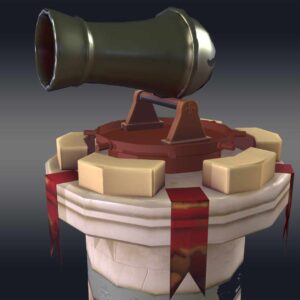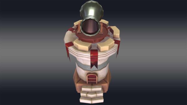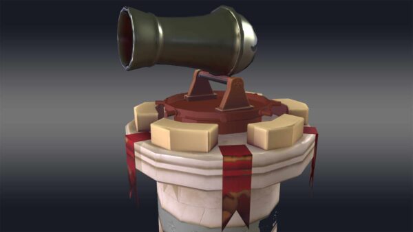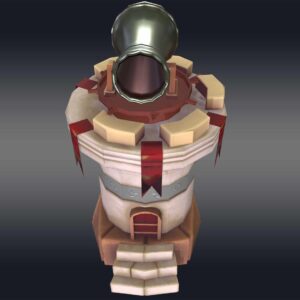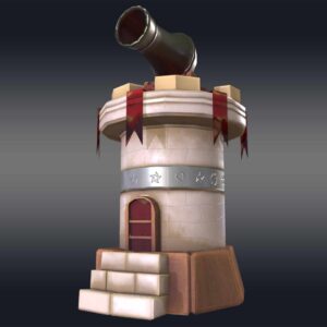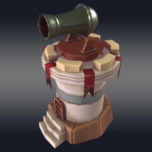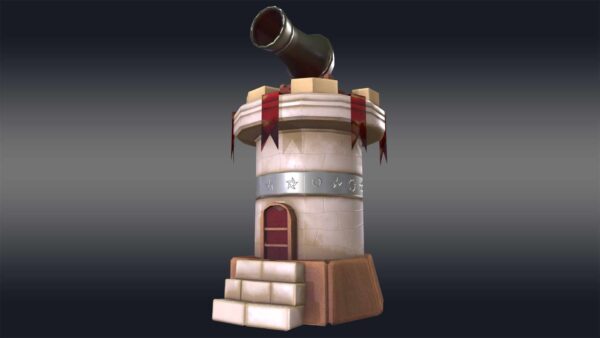 Introducing the “Cannon Tower 3D model,” a stunning, low-poly creation perfect for game developers and 3D artists seeking virtual warfare assets. This model features a cylindrical base topped with a conical roof, crafted from basic geometric shapes like cubes and cylinders for a clean, minimalistic look.