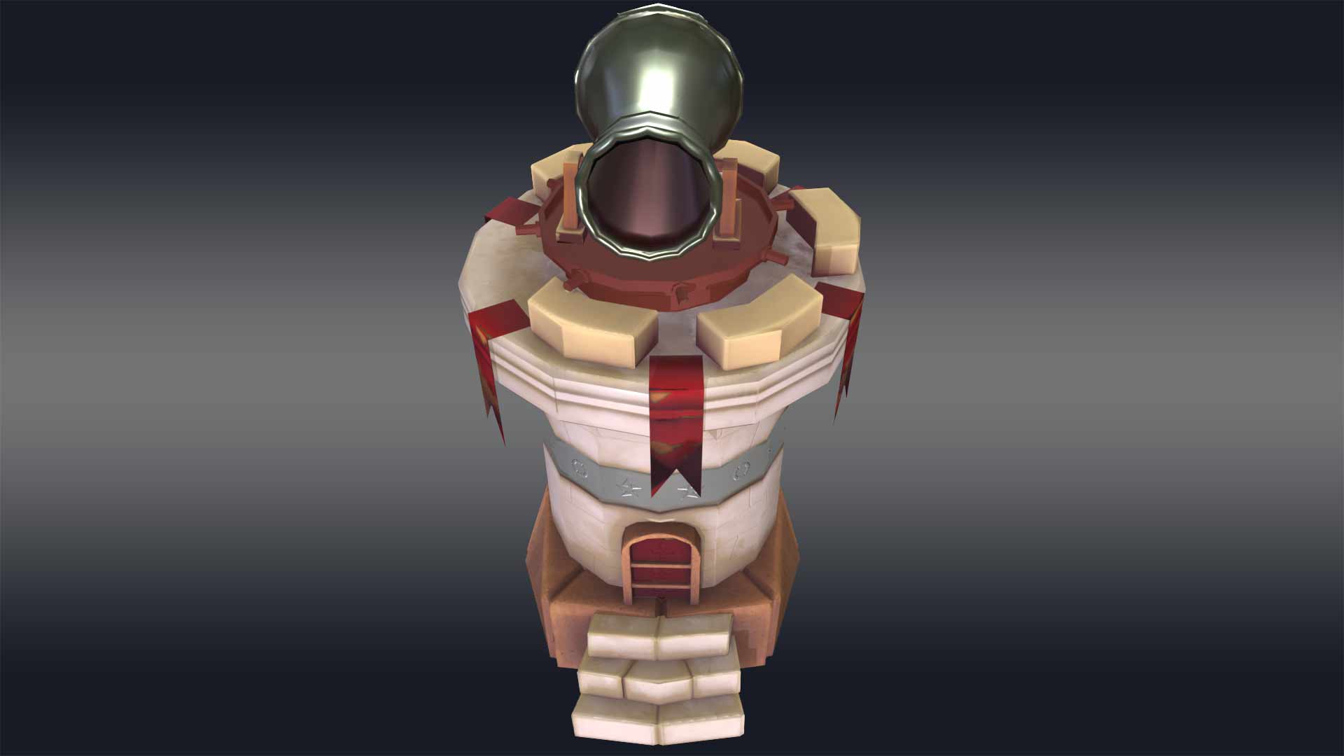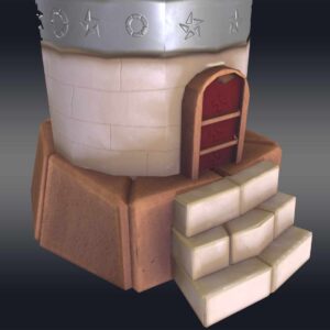 As a game-ready 3D cannon tower model, mounted atop the tower, the cannon is designed as a simple cylinder with a rounded end, poised slightly downward to indicate its readiness to fire in your digital fortress models. The color scheme of the tower utilizes basic, vibrant colors that highlight its low-poly structure, while the cannon boasts a dark metallic hue with subtle highlights that mimic light reflections, ideal for historical tower models. This design not only enhances visual appeal but also maintains simplicity, making it an excellent choice for various game assets and medieval tower 3D renders.