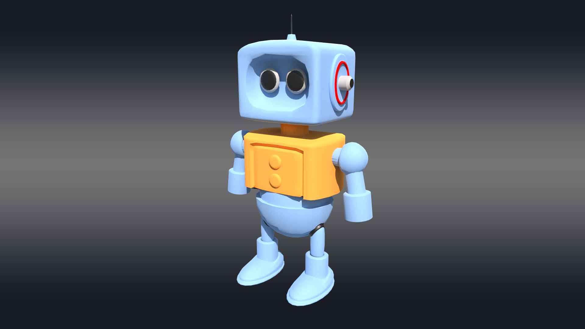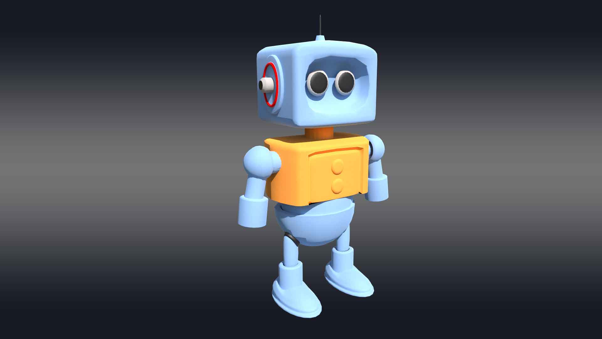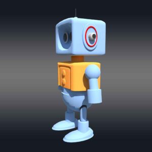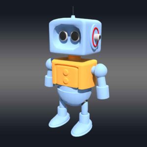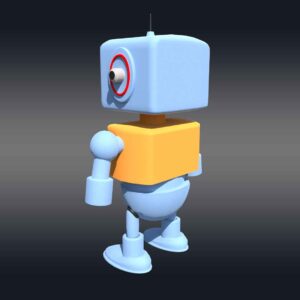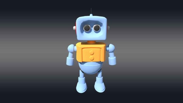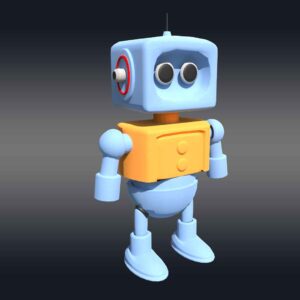 This 3D cartoon robot model is created using Autodesk Maya. It has a smooth, glossy design in vibrant metallic blues and orange, with accents of grey and black. The 3D cartoon robot features a square-shaped, rounded head with glowing eyes, simple ears, and a pulsating antenna, giving it a fun, quirky appearance. Its arms have rounded tips and are short in length, while the legs are stubby with sneaker-like feet, adding to its agile and playful look.