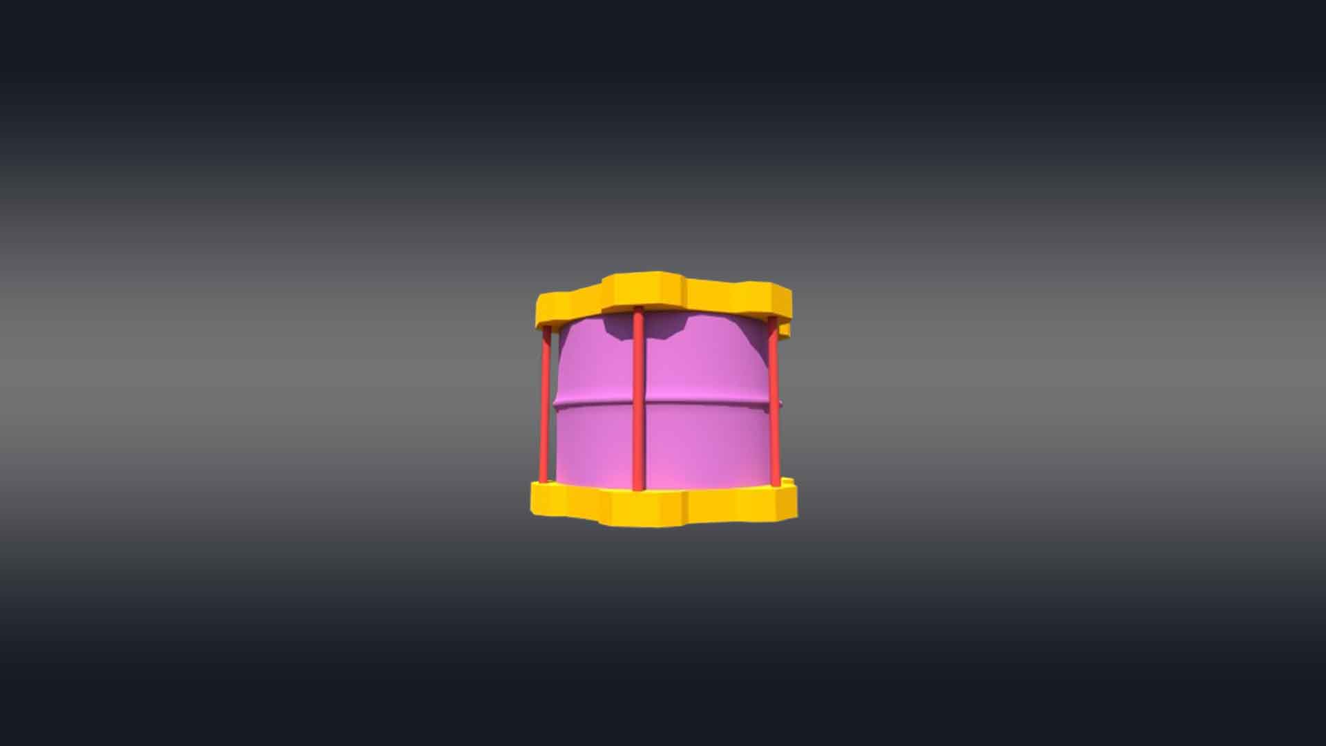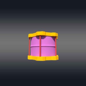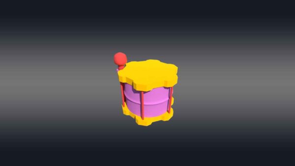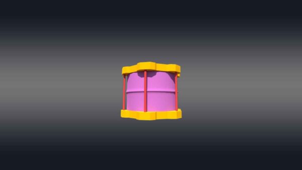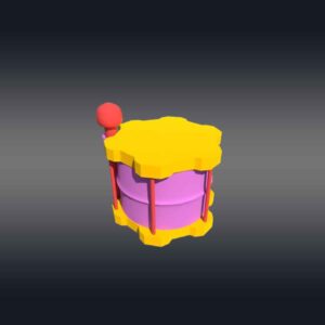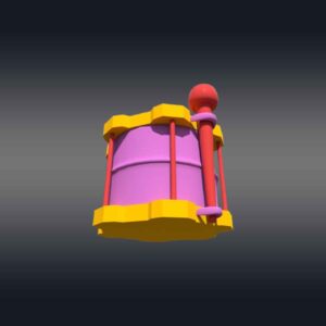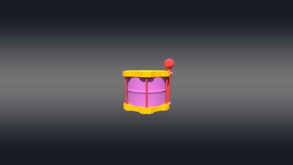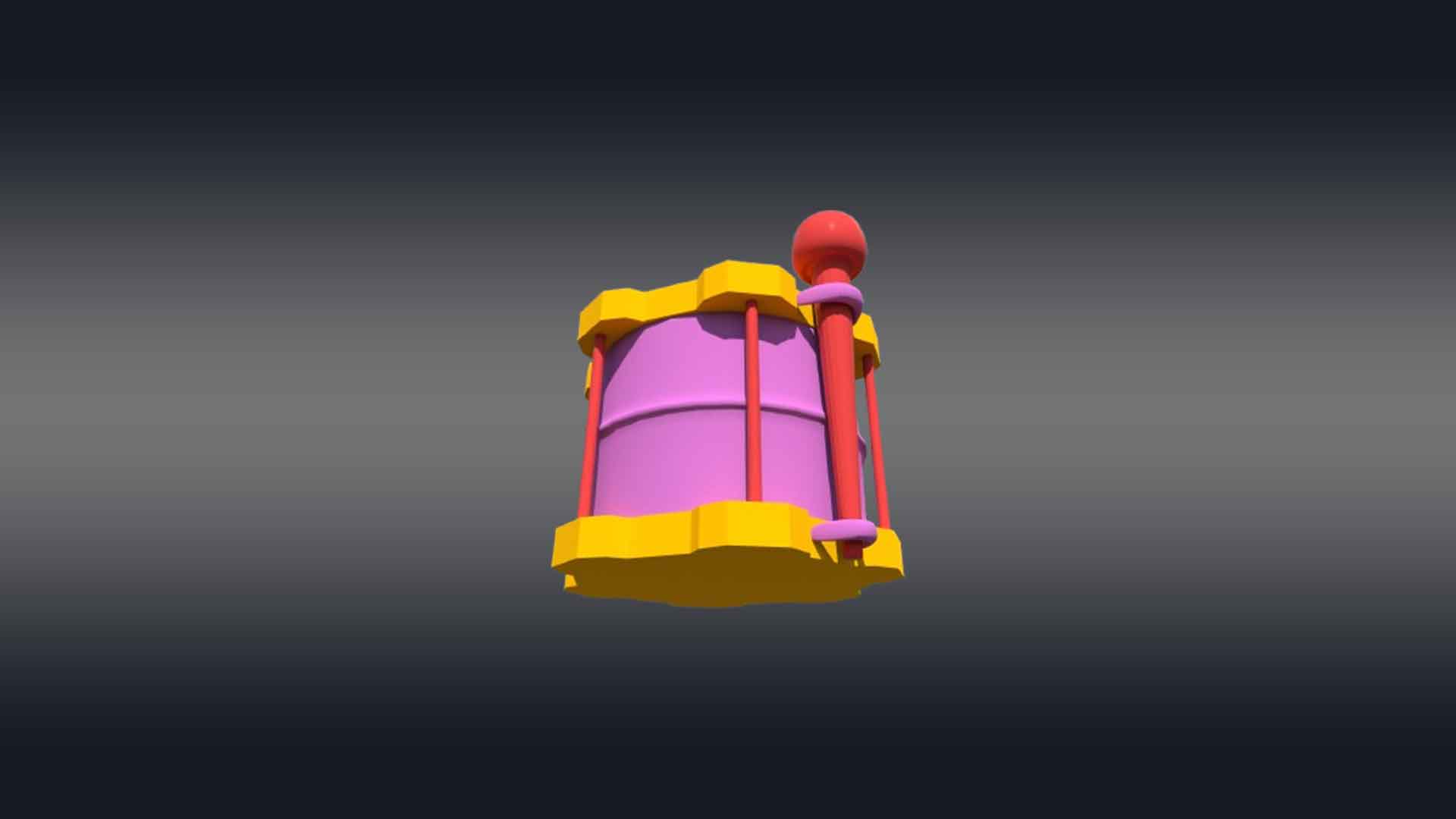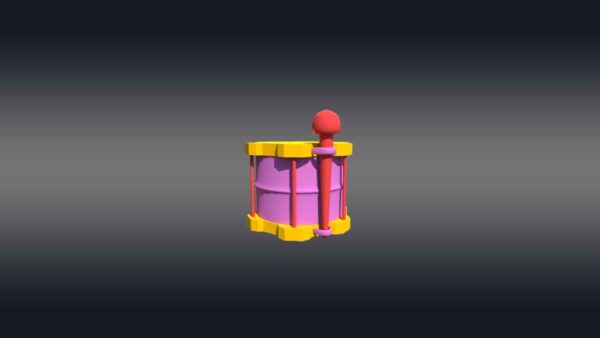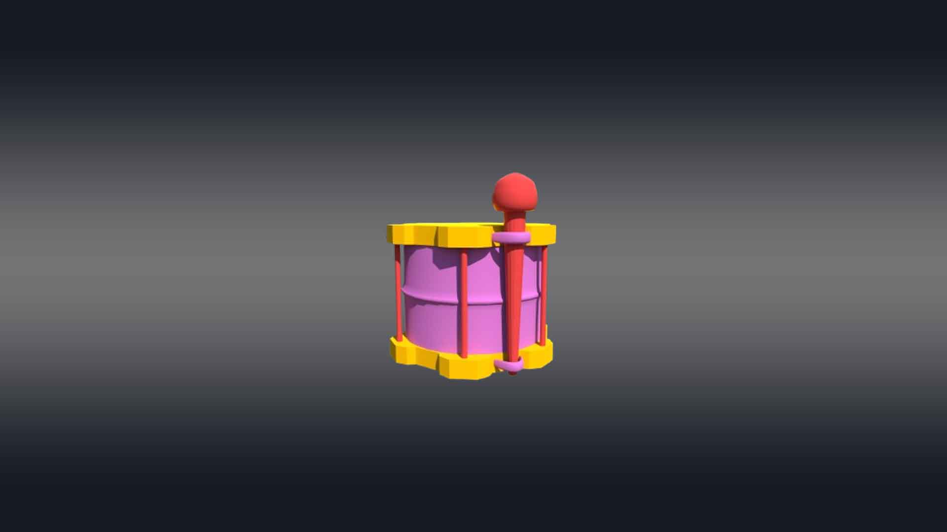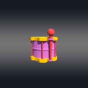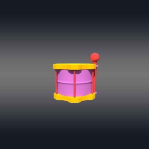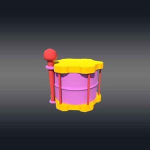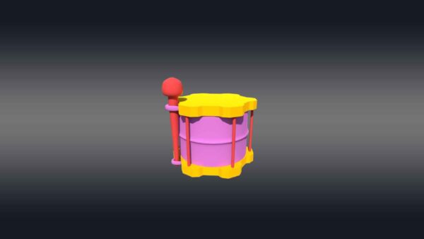 This 3D model drum toy features a compact, cylindrical body, made from brightly colored plastic.The model includes one drumsticks with rounded ends. Ideal for a playroom or educational videos or VR and AR.