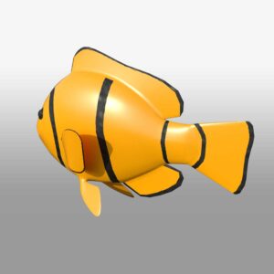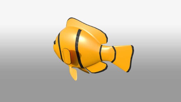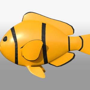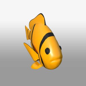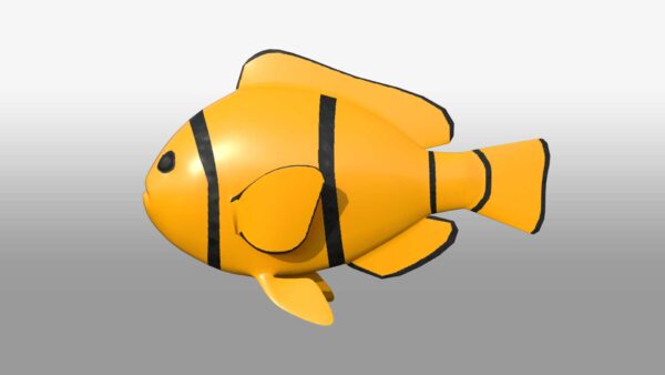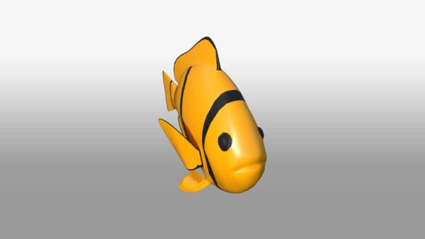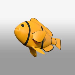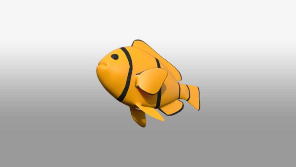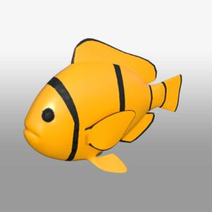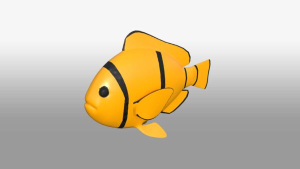 Angular body of this clown fish low poly 3d model is made up of geometric shapes, with sharp edges and flat surfaces. The fins, tail, and body are represented with minimal detail, using clean lines and distinct, large polygons to suggest the basic shape of the fish. The eyes are simple round shaped, and the overall texture is a solid color without intricate details. This stylized approach give this clownfish low poly 3d model a modern abstract look representing the form and structure of a fish.